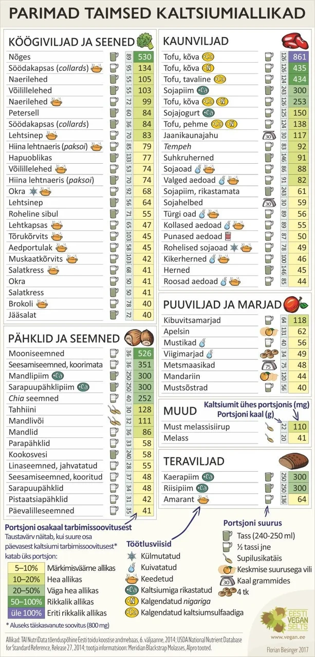 Ka Eesti kuulub nende riikide hulka, kus inimeste peamiseks kaltsiumiallikaks on piimatooted, mis annavad meil 75% tarbitavast kaltsiumist. Sellistes oludes võib tunduda kummaline idee katta oma kaltsiumivajadus vaid taimsete toiduainetega. Kuna aga paljud inimesed üle maailma saavad sellega edukalt hakkama, ei ole ühtegi põhjust, miks see ka veganitel õnnestuma ei peaks. Kui arvestada paljude kaltsiumirikaste ning kaltsiumiga rikastatud toiduainete kättesaadavust, ei ole see ka kuigi keeruline.