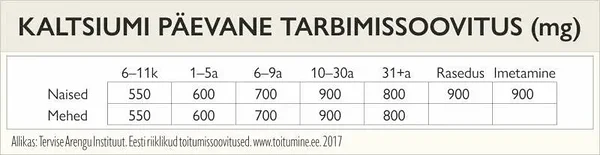 Suurima kaltsiumisisaldusega toiduainetest annab ülevaate järgmine TABEL: