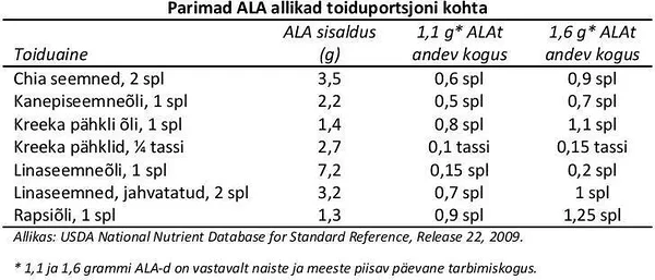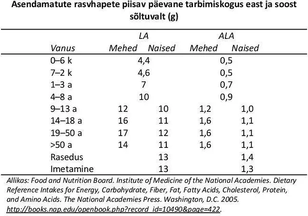 Linoolhappe ja alfa-linoleenhappe piisavad päevased tarbimiskogused on toodud allolevas tabelis: