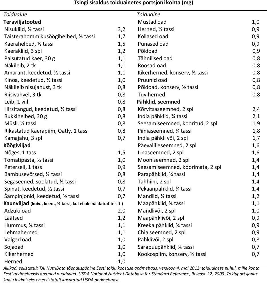 Kuna kehal puudub spetsiaalne tsingi talletussüsteem, on stabiilse taseme hoidmiseks vajalik tagada igapäevaselt piisav tsingi saamine toidust. Parimateks tsingiallikateks on need taimeosad, millest saab alguse uus elu – teraviljad, seemned, pähklid ja kaunviljad. Taimsetes toiduainetes oleva tsingi omastamise peamiseks takistajaks on fütaadid, mis moodustavad mineraalainetega raskesti omastatavaid ühendeid. Toiduained, mis sisaldavad palju tsinki, on tavaliselt ka fütaatiderikkad. Seetõttu on taimetoitlaste tsingivajadus segatoitlastest umbes veerandi võrra suurem.
