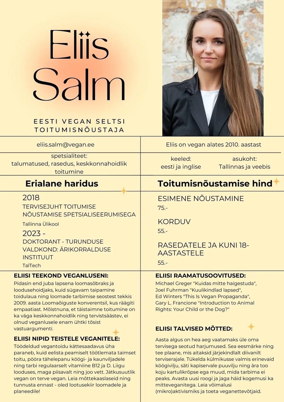 Eesti Vegan Selts tutvustab oma nõustajaid, kelle teenuseid on kõigil võimalik kasutada. Seekordseks toitumisnõustajaks, kelle kohta rohkem infot jagame, on Eliis Salm.