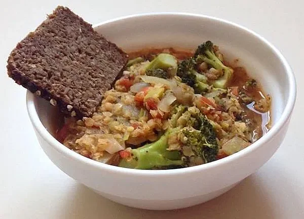 - Kuivatatud läätsed 81 g, mugulsibul 47 g, konserveeritud tomatid 100 g, porrulauk 54 g, brokoli 106 g, porgand 72 g, kuivatatud maitseained 4 g, jodeeritud sool 1 g, vesi 270 g, rapsiõli 3 g, teraleib 30 g.