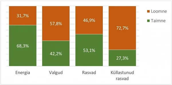 Loomsete ja taimsete saaduste panusest erinevate toitainete ja toiduenergia saamisse annab ülevaate järgnev graafik: