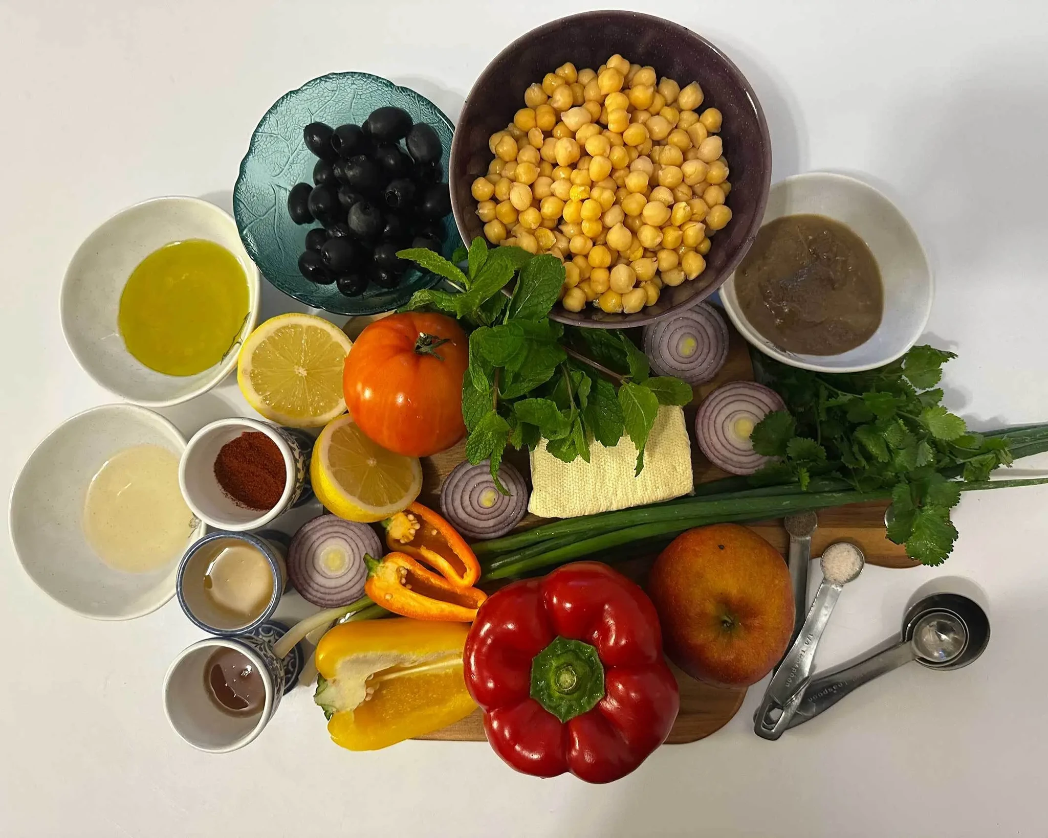 - Sega suures kausis kokku tofu, kikerherned, kõik ülejäänud hakitud koostisosad ja kaste.